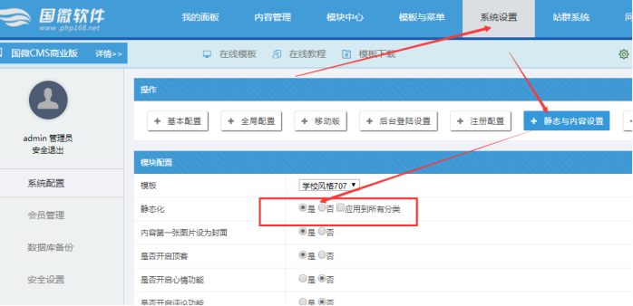 系統設置-----靜態與內容設置--------在是否靜態化里面,勾選 “是”