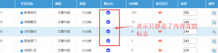 說明:開啟了內容頁靜態,他的標志是是藍色的,如下圖。表示只靜態內容,欄目保持動態。