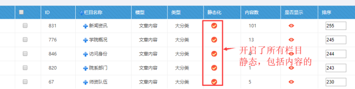 說明:開啟了欄目靜態后,他的標志是這樣的黃色,表示欄目和內容都可以靜態。