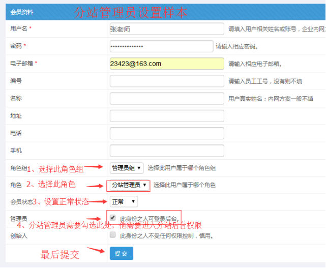 B:如果是站群的分站投稿員、主站的投稿員;添加賬號(hào)時(shí)候可以設(shè)置如下