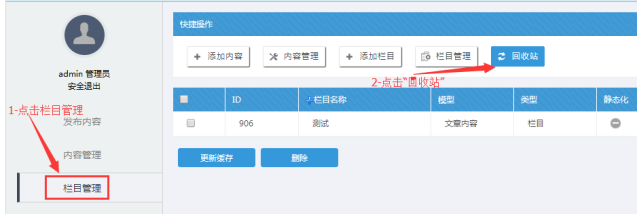 備注:如果在回收站列表中,如果刪除了這些欄目,將無(wú)法恢復(fù)。
