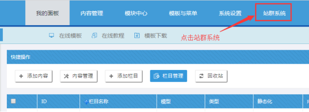 如果站群子站的欄目,無(wú)意中刪除了,也可以恢復(fù)。也是先“登錄后臺(tái)”或直接進(jìn)入登陸“站群后臺(tái)”