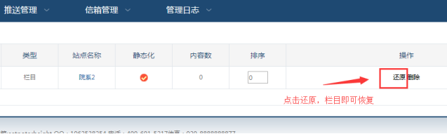 備注:如果在子站回收站列表中,如果刪除了這些欄目,也將無(wú)法恢復(fù)。
