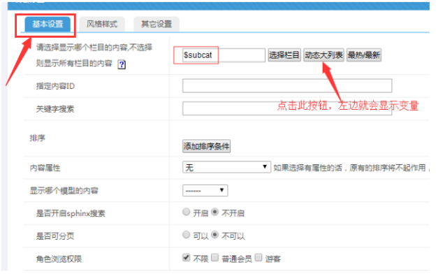 F:切換到基本設置----------點擊“動態大列表”按鈕------左邊就會自動顯示$subcat, 基本設置下其他地方