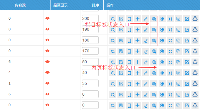 內頁標簽:點擊此處,可以進入內頁可視化標簽狀態; 欄目合并:將此欄目合并到其他欄目