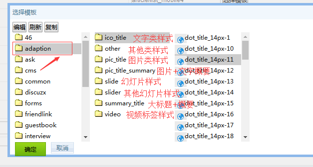 為了方便選擇,每個模板都提供樣式縮略圖;另外這些模板可以任意命名;下面是大分類模板。大分類一般以big_list開頭命名。