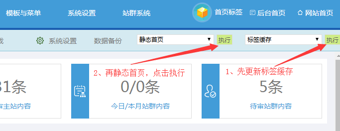 靜態(tài)首頁:如果我們想首頁(靜態(tài)的,不帶index.php動態(tài)尾綴的)想立刻看到新增內(nèi)容變化;可以立刻選擇“靜態(tài)首頁”,點擊執(zhí)行按鈕即可。