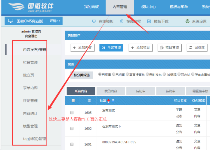 內(nèi)容管理:此處可以進行文章內(nèi)容刪除、編輯、審核、設(shè)置屬性、搜索篩選、推送分站等操作。