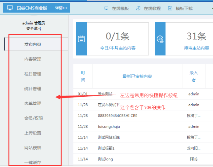操作提示此處可以快速修改最新發(fā)布內(nèi)容、最新需審核內(nèi)容;同時點擊鏈接可以進去列表;可以平常節(jié)約很多時間。