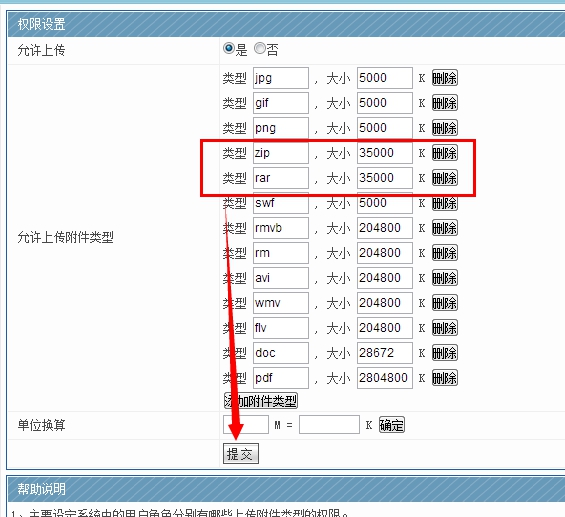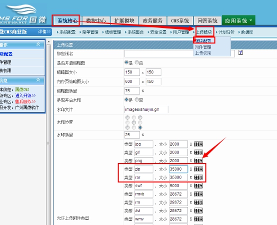 1、 進入網(wǎng)站后臺:找到 “上傳模塊”----“模塊配置”-------對需要的格式進行大小設(shè)置,里面zip和rar格式的附件,我們設(shè)置了35M的大小,然后點擊提交。