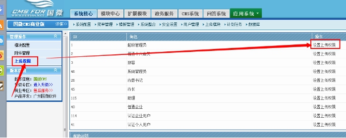 2、點擊左邊的“上傳權(quán)限”-------對超級管理員,點擊“設(shè)置上傳權(quán)限”