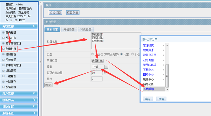 2:創建下載小類別。可以批量創建。上面三個欄目可以換行。然后選擇所屬大分類,就是剛剛那個創建的下載頻道。然后選擇下載模型,提交即可。