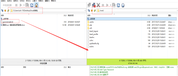 2、連接成功之后,將本地的gwcmsinstall.sh文件拖入到root目錄下