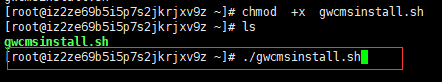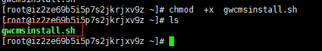 2.輸入命令chmod  +x  gwcmsinstall.sh(賦予該文件執行權限),輸入命令ls,該文件名顯示為綠色即表示配置權限成功。