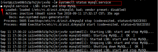 6.最后一步需要檢查數據庫是否啟動,輸入命令 systemctl satus mysql.service  圖中的小圓點沒有顏色就是沒有啟動。