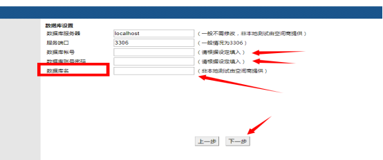 進入到數據庫設置頁,填寫之前獲取到的數據庫信息。數據庫名由用戶自定義命名。點擊下一步。