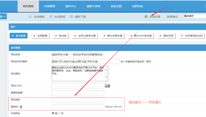 用舊網站后臺賬號密碼登陸后(或強制登陸后臺),此處就可以設置新的網站域名和基域名。