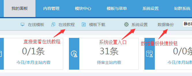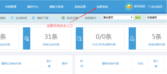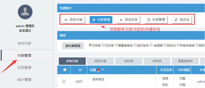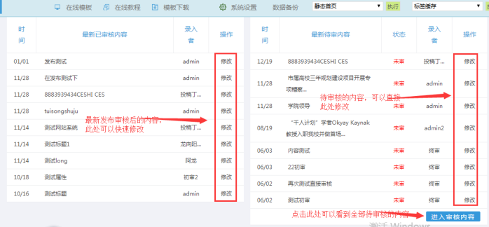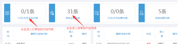 操作提示此處可以快速修改最新發(fā)布內(nèi)容、最新需審核內(nèi)容;同時(shí)點(diǎn)擊鏈接可以進(jìn)去列表;可以平常節(jié)約很多時(shí)間