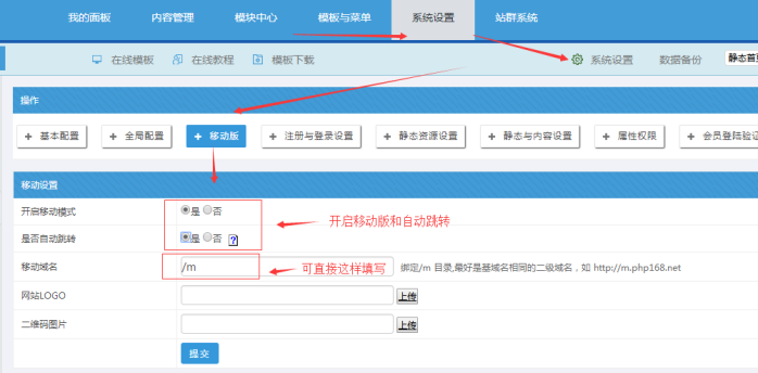 如果要開啟手機(jī)版,就按下面設(shè)置;手機(jī)版的訪問路徑為:  域名/m