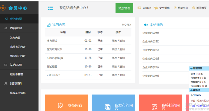 會員中心效果會員中心功能包括投稿、內(nèi)容審核、數(shù)據(jù)刪除、更新首頁等功能;所有人的內(nèi)容操作基本都