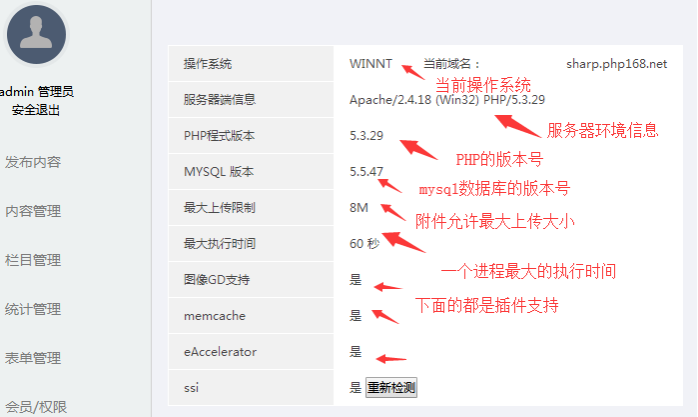 后臺初始頁左下方,此處可以看到安裝此網(wǎng)站的操作系統(tǒng)、數(shù)據(jù)庫版本、PHP版本、最大上傳設(shè)置、各個(gè)插件