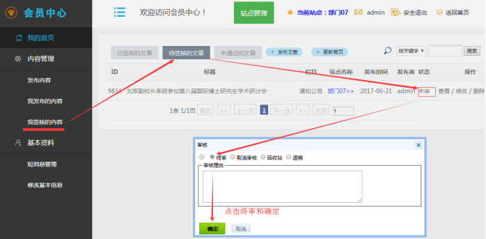 進入子站會員中心---點擊“我簽核的內容”----點擊“待簽核的文章”----點擊“未審”----勾選“終審”----點擊確定