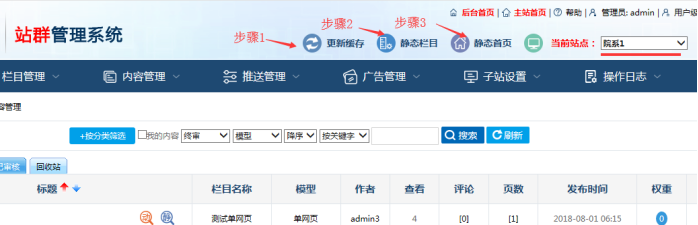 B:子站后臺更新方式(對首頁、欄目看不到更新內容均有效果)
