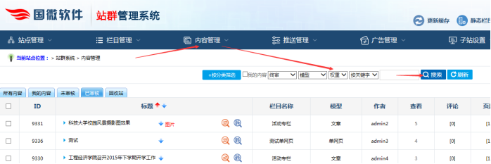 后臺--點擊內容管理----選擇權重----點擊搜索; 就可以看到設置了權重的所有內容