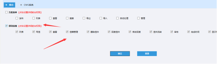 信箱模塊支持信件流轉(zhuǎn)、每個部門可以設(shè)置不同管理員。他的設(shè)置權(quán)限模式和上面類似,對個人設(shè)置權(quán)限即可。信箱只有部分系統(tǒng)
