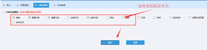 權(quán)限設(shè)置的時候,首先設(shè)置權(quán)限的開關(guān),選擇后然后提交。