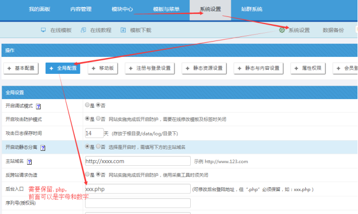 系統為了安全,我們一般安裝后,會修改后臺網址;但是“.php”這個后綴務必不能修改;前面可以是數字字母,不能是特殊符號。設置后,直接采用新的后臺地址訪問,比如:域名/xxx.php