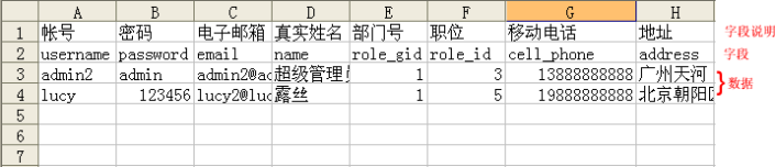 第三行開始為要導入的數據,其中“帳號”,“密碼”,“電子郵箱”三項是必不可少,否則不能導入。其它項若無數據則可以留空。
