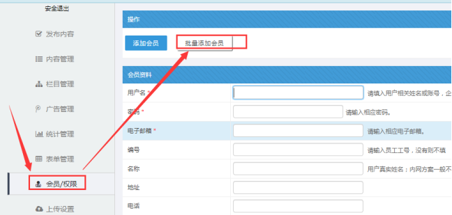 【后臺】→【會員/權限】→【批量添加會員】→【選擇文件】,點擊【選擇文件后】,彈出框中選擇要上傳的文檔,