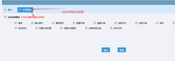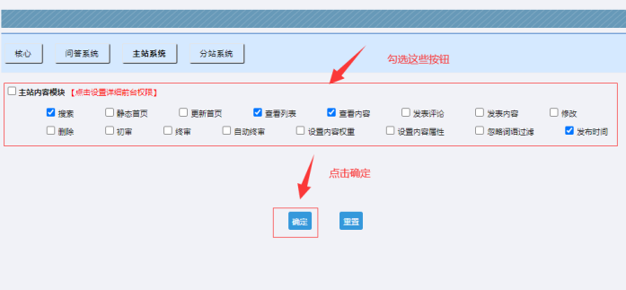 B:點擊------主站系統-----可以勾選這些(這個是權限的基礎開關,必須這里設置了,后面設置的細分權限才有效果;)---------然后點擊【確定】提交!
