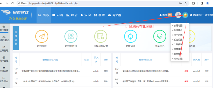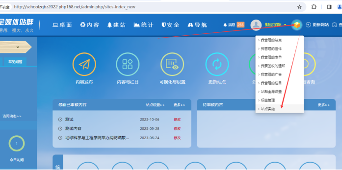 方法1、點擊進入【主站后臺】------鼠標放在箭頭所指圖標上------在下拉的菜單中,鼠標點擊【站點實施】按鈕即可