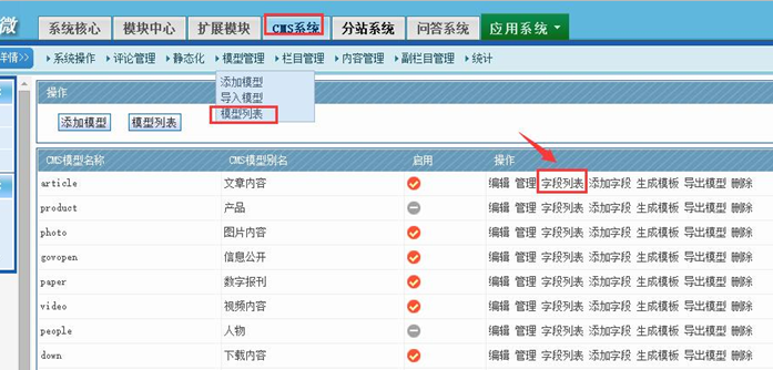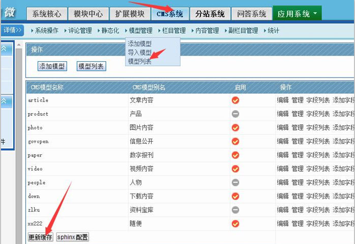 模型中,無法顯示。少了對應的模型,比如product模型;被你刪除了那個模型,而這個模型的欄目又有內容;所有有內容的模型,不要隨便刪除模型的。