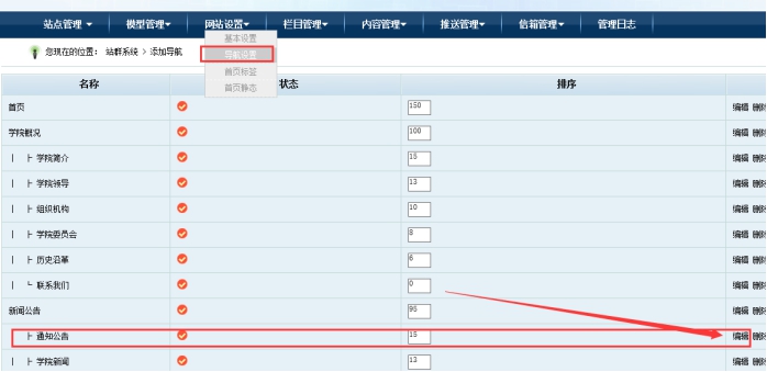 處理方法:分站后臺---網(wǎng)站設(shè)置---導(dǎo)航設(shè)置----點擊“通知公告”的編輯按鈕