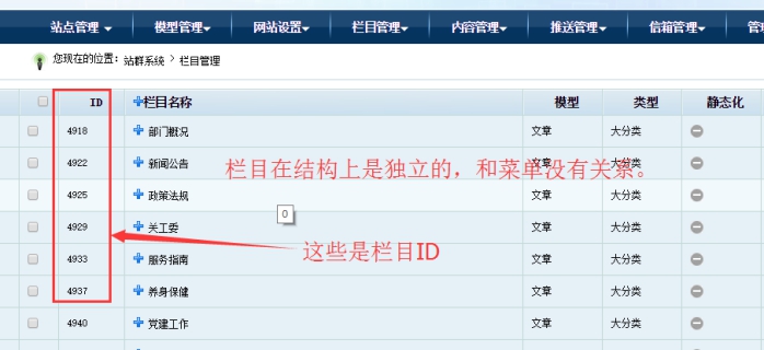 欄目:欄目是獨立的,和菜單沒有關(guān)系。左邊是欄目的ID號,每個欄目都有一個自己的ID。欄目如下圖: