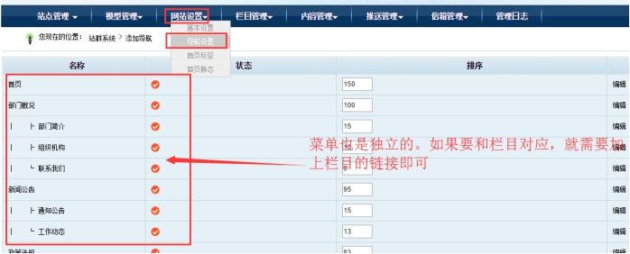 菜單:菜單也是一個獨立的東西,他事先本來和欄目沒有關(guān)系。要產(chǎn)生關(guān)系,就需要將菜單上填寫欄目鏈接地址。
