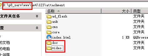 C、 在服務器里面先創建需要的文件,程序根目錄下/attachement下創建視頻存的文件為video ,文檔就放doc