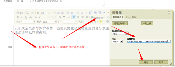 編輯文章內頁,鼠標先在編輯框需要的地方點擊下,然后點擊編輯框上面的“超鏈接/附件”按鈕。彈出框中輸入上面的附件地址即可。然后點擊確定。