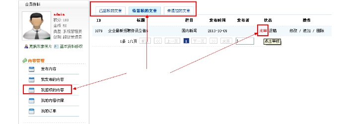 欄目管理員進(jìn)入會員中心;點擊頂部的CMS系統(tǒng)-----然后點擊我簽核的內(nèi)容,可以看到待簽核的文章按鈕,切換后,你可以審核你要審核的內(nèi)容,點擊未審按鈕即可;當(dāng)然,你可以選擇退稿。退稿后,用戶可以重新修改再提交投稿。