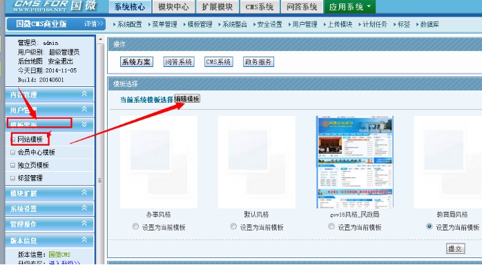 1、進入網站后臺,選擇模板,點擊編輯