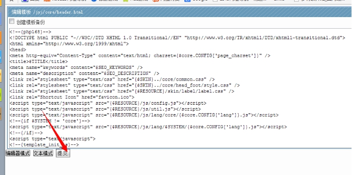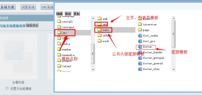2、選擇模板名稱,比如這個模板名字叫jyj,點擊進入。可以看到:core里面放公共頭部和尾部等公共模板。