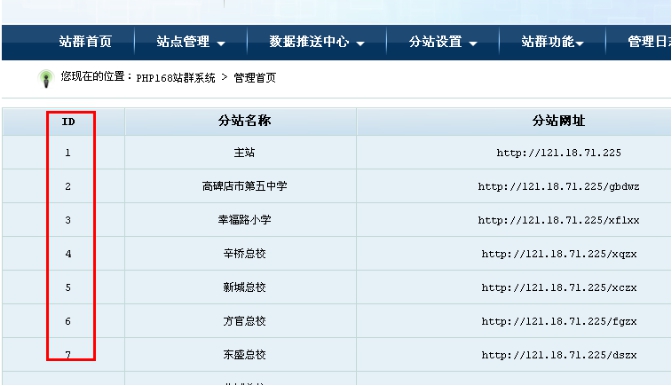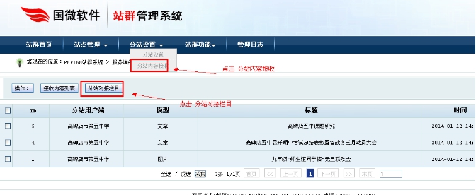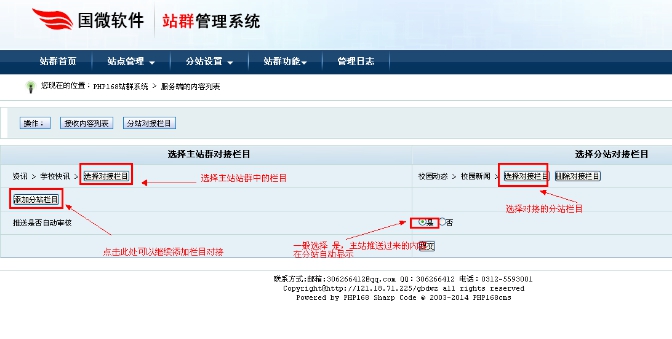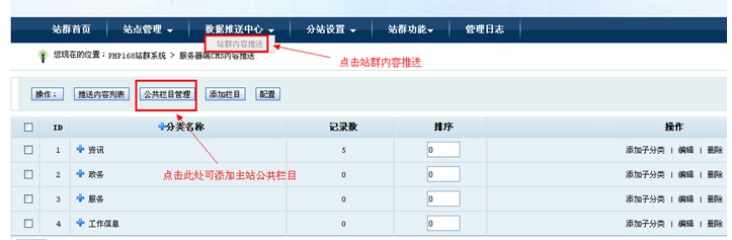 2、主站站群的欄目在此處管理和添加,他主要是將各分站推送給主站的內容,在此處進行分欄目入庫,同時方便這些欄目和各分站欄目對接。這樣主站站群推送下去的內容就可以準確的在分站具體欄目中顯示。