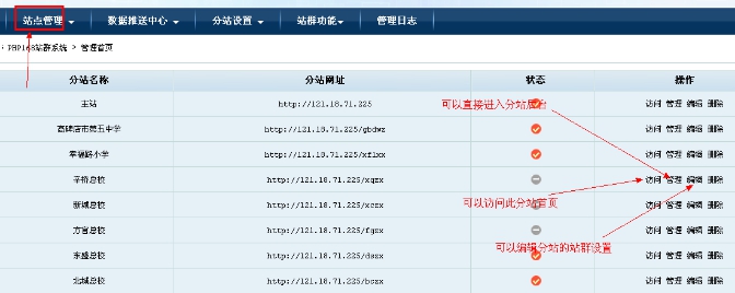 3、打開“站點管理”,我們可以看大所有分站的列表;點擊“訪問”可以直接進入該分站的首頁;點擊“編輯”可以對該分站的站群設置進行重新編寫;點擊“管理”就可以直接進入各個分站的后臺,這個很常用。