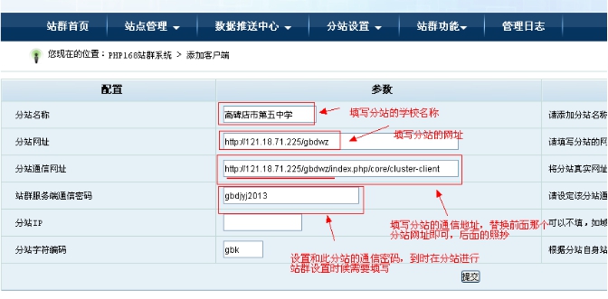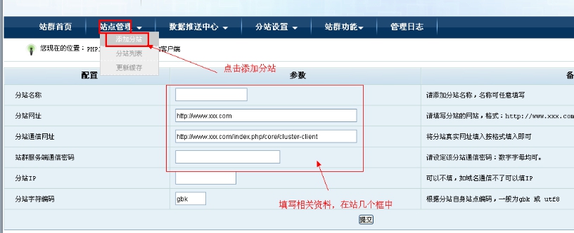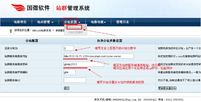 1、分站設置:點擊進入分站設置;自身分站的ID是從主站的列表那邊獲得;站群服務器端通信密碼也是主站那邊設置時候獲得的;具體查看下面圖片詳細設置;留空的地方可以不填。