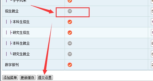 操作方法:如果有些菜單我們不想在前臺顯示,又不想刪除,那么就可以操作隱藏菜單。點擊那個打鉤的按鈕,點擊后變灰色,就表示隱藏了,可以同步操作多個;最后提交即可:直接將一級菜單隱藏,那么下面的子菜單全部也不會顯示了。