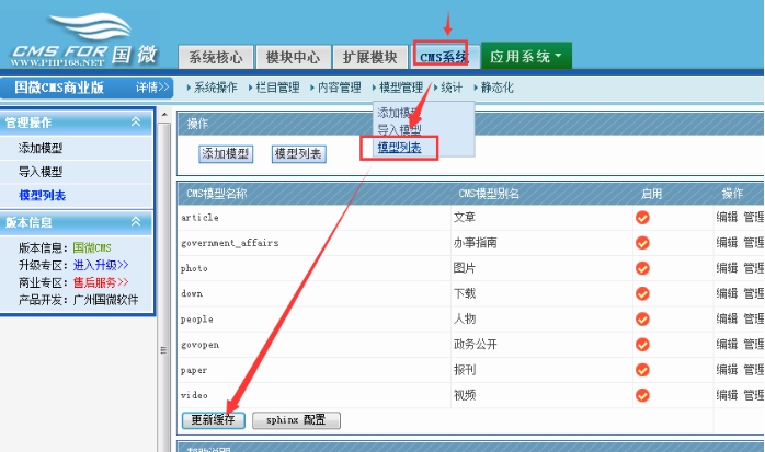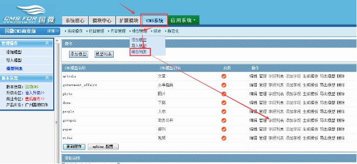 1、進(jìn)入網(wǎng)站后臺----點(diǎn)擊cms系統(tǒng)---模型列表---政務(wù)公開---字段列表