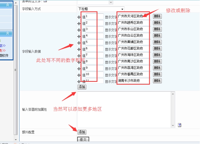 3、進(jìn)入后,里面可以修改現(xiàn)有的地區(qū)。也可以添加更多地區(qū)。左邊的那個值是數(shù)字,可以任意添加,但是需要不同。最后點(diǎn)擊提交。